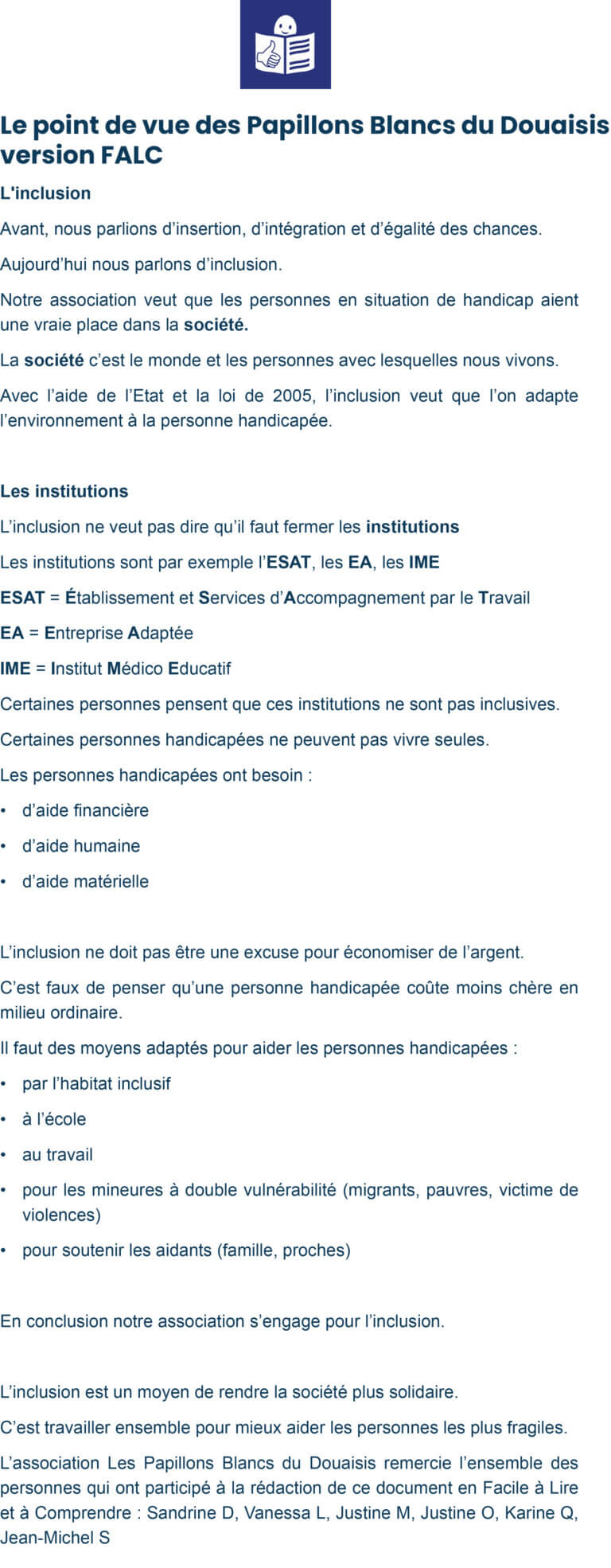 Retrouvez ci-dessous une définition de l’inclusion et le point de vue des Papillons Blancs du Douaisis, en version en version Facile à Lire et à Comprendre (FALC).